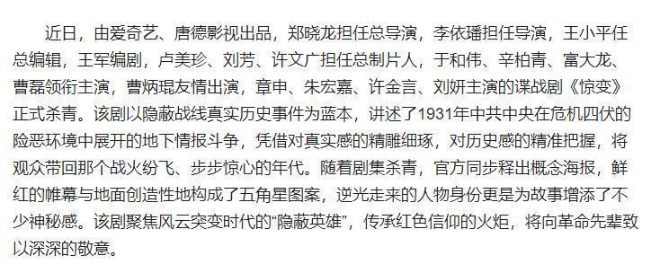 但这还不算完,谍战剧《惊变》也行将播出了,行为百看不厌的电视剧题材,谍战剧不错说是许多不雅众的“下饭神器”,险些是部部经典。